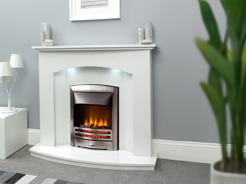 Shown in Pearl White with the SLE40i electric fire, the Mayfield Suite is available in Powder White, Smoke Grey, Champagne Cream or Pearl White finishes.